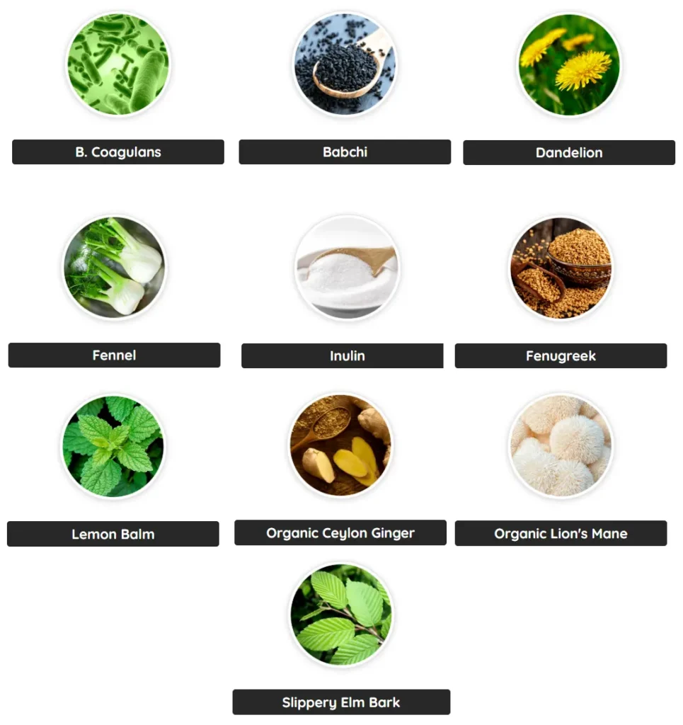 Formulated with B. Coagulans (probiotic) and Inulin (prebiotic) to help balance the gut microbiome. May reduce bloating and support digestion, while Slippery Elm and Dandelion aid digestive and liver function.